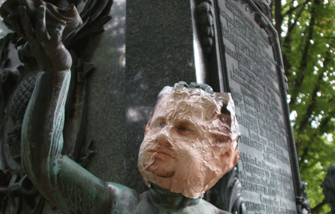 Ich mit den Attributen für Wehrkraft (Schwert und Schild), Versorgung (Wassermuschel), Gewerbe (Flügelrad und Hammer) und Geschichte (Buch). Ich mit Attributen, 2013 Intervention in public space, “Ich...